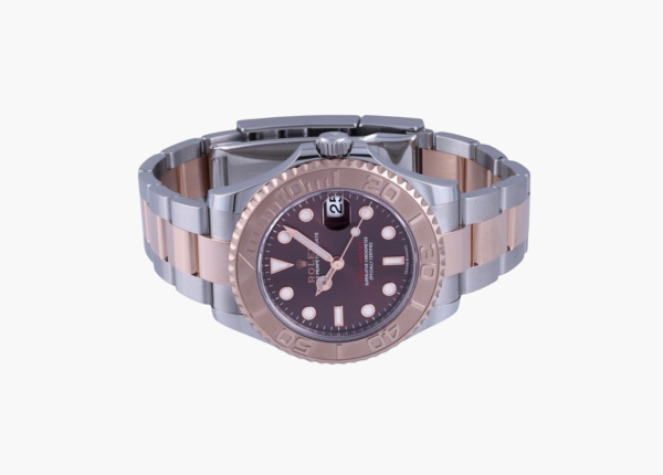 ベゼルとダイヤルには高級素材のプラチナを使用し、赤いモデル名が秒針とダイヤルのチョコレート色に映える組み合わせとなっています。