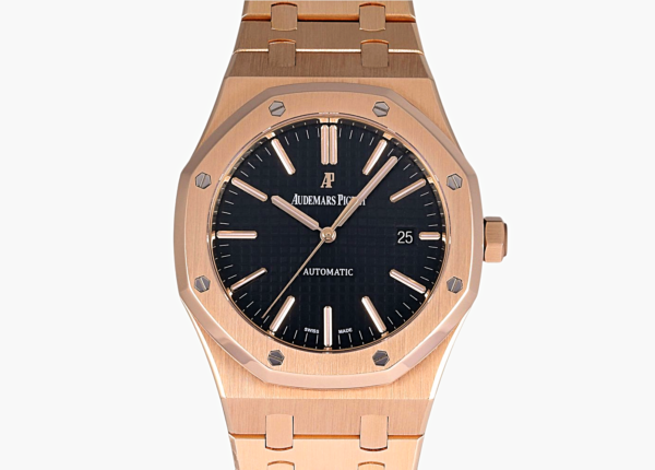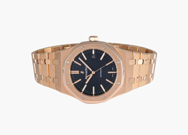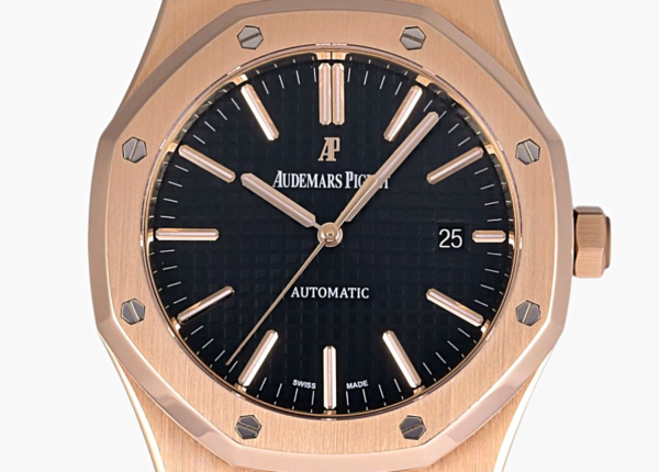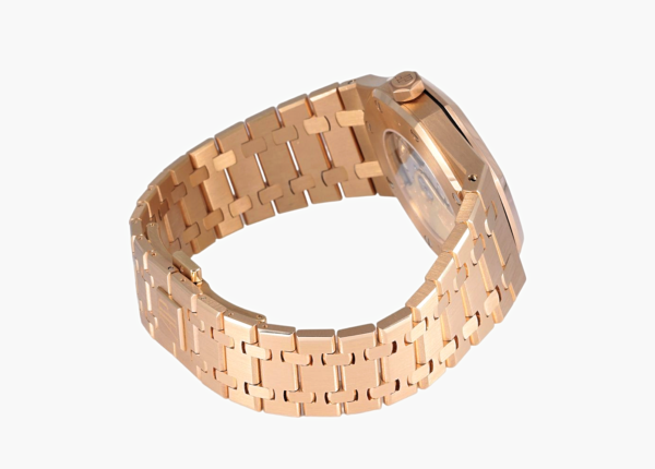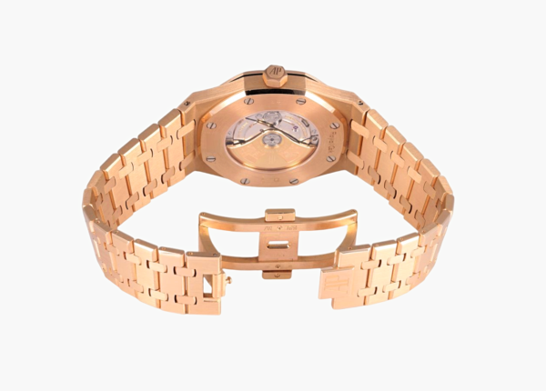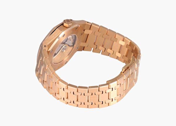 こちらは2012年に発売されたロイヤルオーク 41mmモデル 15400OR.OO.1220OR.01です。8角形ベゼルとグランドタペストリーの文字盤、ケース一体型のブレスレットが特徴です。ムーブメントに新開発の自社製自動巻ムーブメントCAL.3120を搭載しており、スケルトンの裏蓋から22金ローターに施されたオーデマ・ピゲのロゴと創業者両家の紋章の彫金を確認することができます。