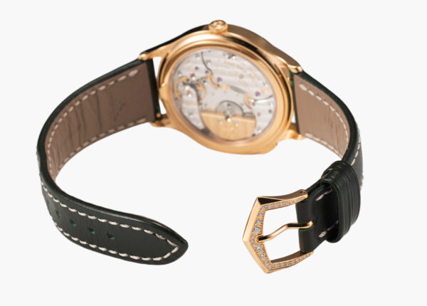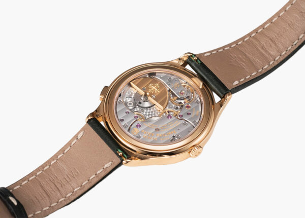 2022年に発表されたこのモデルは、パテックフィリップの中でも珍しいグリーン文字盤センターは、手仕上げのギヨシェ装飾により古風な篭の編み目を精巧に再現しています。